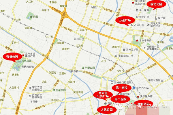 2、第一医院、常州二院、南大街公共广场、万达广场、红梅公园、青枫公园、新北公园、人民公园(待开放区域)