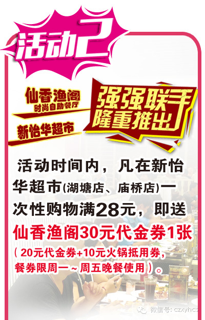 再不来,疯狂的龙虾季就过去啦!一次性购物满28元,即送仙香渔阁自助餐厅30元代金券,三种口味的龙虾尽情享用。