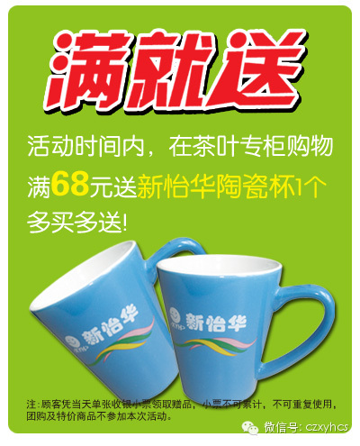 爱の新怡华贴心贴到您的心坎里,无论您是否去踏青,春季都应多喝水。活动期间,在茶叶专柜购物满68元,免费赠送新怡华陶瓷水杯哦!